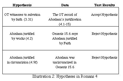 The argument in Romans 3:31-4:12 is an interesting case of hypothesis proposal and testing. The hypothesis proposed is that the Law witnesses to justification by faith for both Jew and Gentile. Paul tests this hypothesis against the best Old Testament case--Abraham--and the hypothesis is confirmed. Throughout this passage Paul will advance a hypothesis, then look at the record of Abraham to confirm or