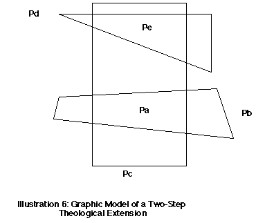 In a sense, the first half of this process is the reverse of syllogistic chaining, in that instead of repeated syntheses, repeated analyses take place. This "backward chain" continues until the desired major premise (or pivot proposition) is found. At that point, a syllogistic chain begins and continues until the desired conclusion is reached. Theoretically then, any proposition-space could lead to any other proposition-space via extension, and indeed this is exactly what we would predict on the basis of Paul's view of theology as systematic and interlocking (Chapter II).
