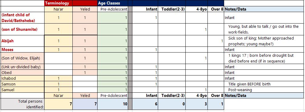 [The only precise age-connected term for ‘children’ is the taph of Deut 1.39 and the follow-on mentions. In Numbers 14:28-31, the ‘little ones’ are defined as individuals under 20 years of age. There is also a ‘valuation category’ of 5 years to 20 years in Leviticus 27, but there is no specific term for that age given there.]